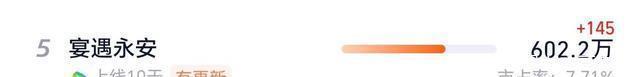 5、《宴遇永安》市占率7.71 主演:王影璐,李昀锐 介绍:这部轻喜穿越剧的市占率从首日2.6%升至20.1%。热度表现强劲,腾讯视频峰值达28000,登顶了古装榜是2025年轻喜剧的黑马。